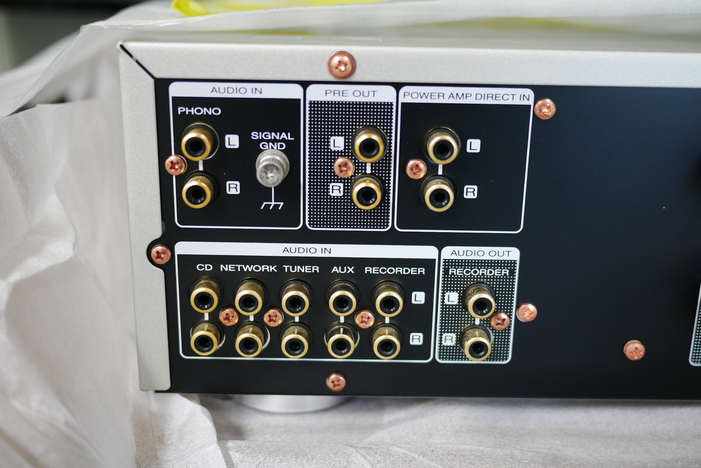전통적인 오디오 기기를 접하면 가장 무서워 하는게 이렇게 수많은 단자가 포진한 모습입니다. 리시버 앰프의 경우에는 더욱 많은 입력 출력단이 있는데요. 실제로 기기를 연결해보면 인으로 들어가는 제품 (EX CD플레이어, 턴테이블) - 인티앰프 - 스피커 로 하나씩 연결하면 되기 때문에 어려운 부분은 없습니다.
